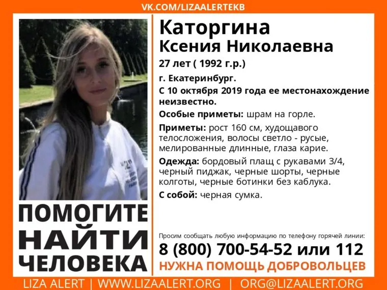 «Помогите найти человека! Пропала #Каторгина Ксения Николаевна <…> С 10 октября 2019 года ее местонахождение неизвестно», — сообщает поисковый отряд «Лиза Алерт». Позже автомобиль был найден у перекупщиков, но девушку так и не нашли, сообщили в группе «Верхняя Пышма Среднеуральск 8 район».