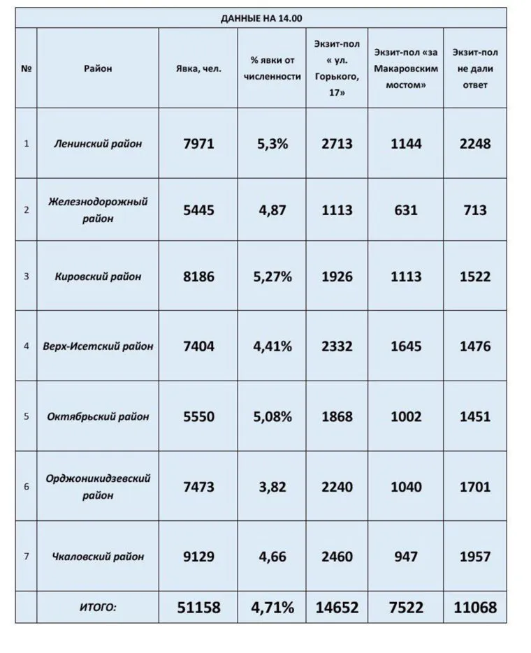 14:06 Явка на 14-00: всего проголосовали 51158 человек. На этот раз самые высокие показатели в Чкаловском районе — 9129 человек.
