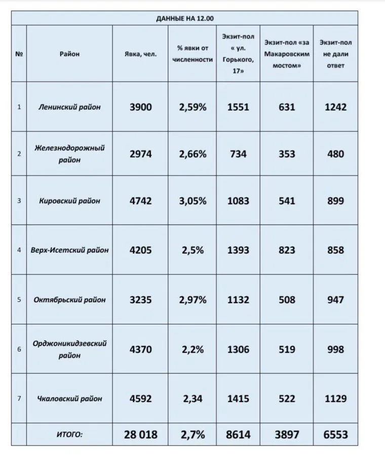 12:00 На данный момент проголосовавших уже 28018 тысяч человек. Это 2,7% от числа избирателей. Самая высокая явка в Кировском районе — 4742 человека. Самая низкая в Железнодорожном районе — 2974 человека.