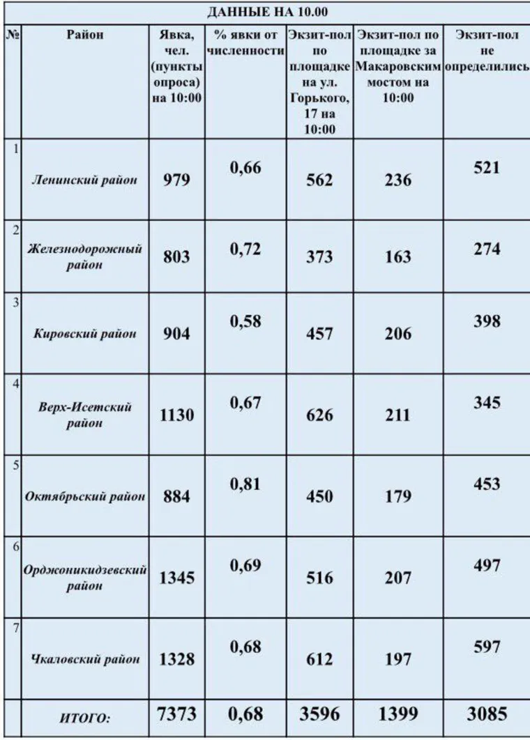 09:37 На опросные участки пришли уже более шести тысяч человек. Больше всего голосуют на ВИЗе, в Ленинском и Чкаловском районах.