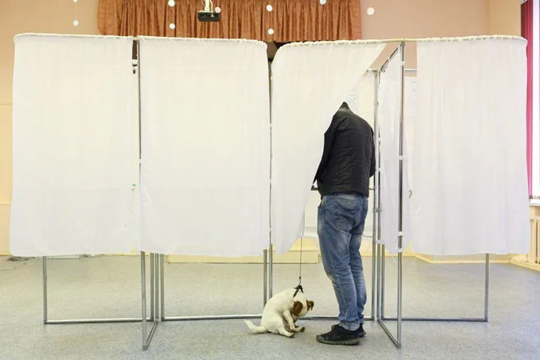 14:42 На один из участков пришла голосовать собака. Знакомьтесь, джек рассел терьер по имени Шерлок. Судя по первому фото, заходить в кабинку псу не очень хотелось.