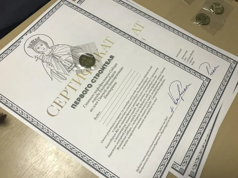 08:55 Тем, кто пришел с приглашением на опрос, дарят памятную монету с изображением Святой Екатерины и сертификат первого строителя.