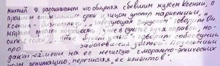 «Ксения — бизнес-леди, «заведующая борделем», — говорит он. [Таксист] Марат вносит подробности: «У нее в сумочке куча справок, носит с собой», «у нее букет целый», — говорит собеседник про заболевания убитой. Подельники дают намеки на ее нечистую с морально-этических норм репутацию, перечисляя «клиентов», — сообщается в записке из СИЗО.