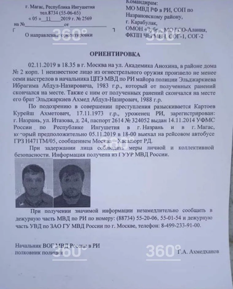 Подозреваемым в убийстве начальника Центра по борьбе с экстремизмом по Республике Ингушетии Ибрагима Эльджаркиева и его брата в Москве назван 45-летний Курейш Картоев. Скриншот ориентировки появился в интернете.