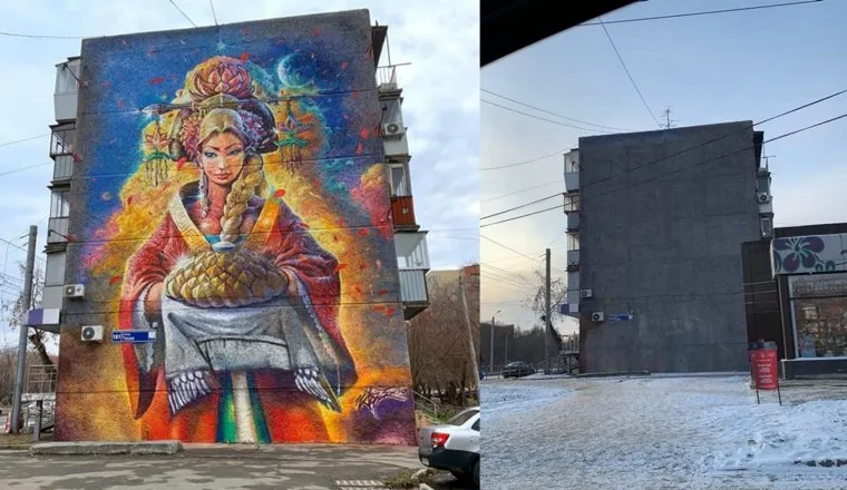 В Челябинске неизвестные закрасили серой краской масштабное яркое граффити, нарисованное на стене дома на улице Труда, 161. По словам авторов проекта, уничтожить рисунок могло местное рекламное агентство, у которого есть свои планы на это место.