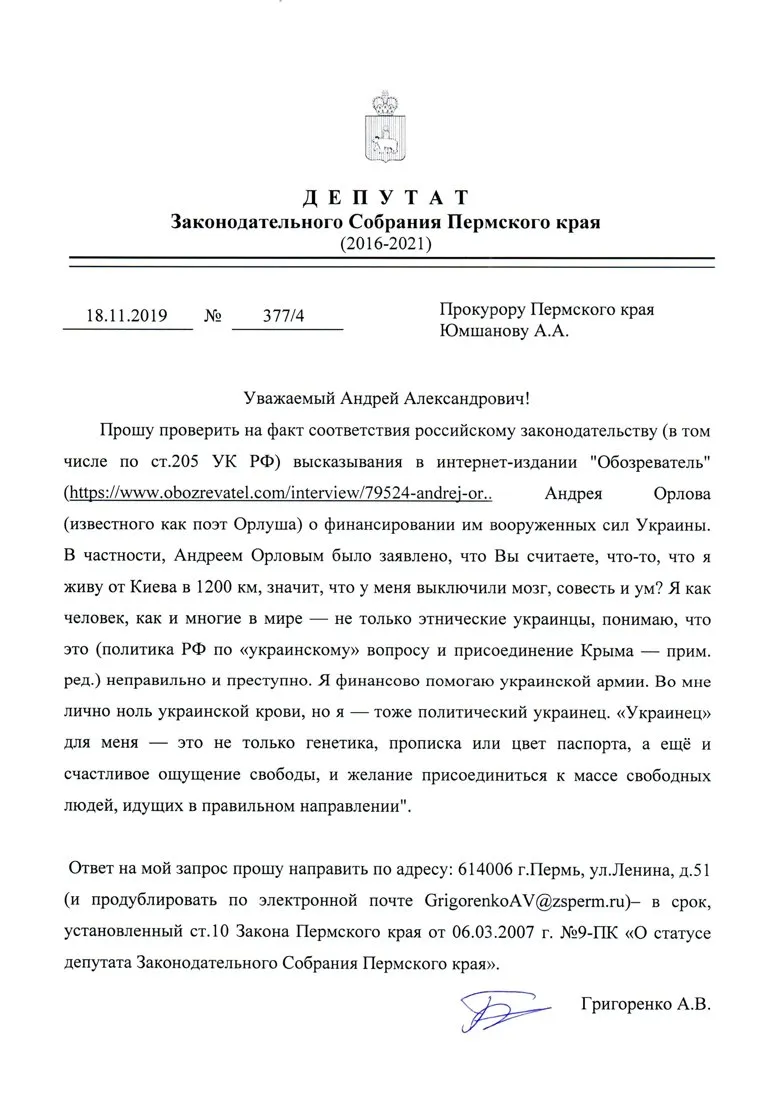 Депутат пермского краевого парламента Александр Григоренко написал заявление на поэта Орлушу (Александра Орлова), сообщил «URA.RU» сам депутат. Он пояснил, что просит проверить высказывание Орлуши, где тот признается в финансировании вооруженных сил Украины, связывая это с поддержкой террористических организаций.