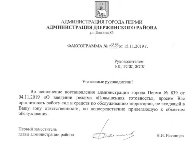 Мэрия Перми просит представителей ТСЖ, ЖСК и управляющих компаний заняться уборкой не только придомовых территорий. Соответствующее письмо, которое направила управленцам администрация Дзержинского района Перми, опубликовал в Facebook (деятельность запрещена в РФ) председатель ассоциации ТСЖ «Пермский стандарт» Александр Зотин.