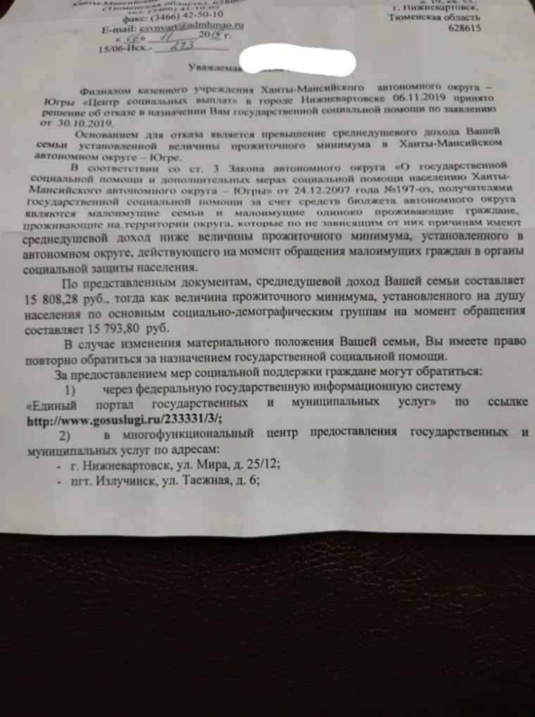 «То есть мы с мужем и наши трое детей переедают на целых 14 рублей. Неужели нашей соцзащите настолько наплевать на социальное положение общественности, что они могут штамповать отказы, даже не разобравшись в каждом случае по отдельности?» — задается вопросом вартовчанка. Женщина приложила фотографию документа и просит совета, как ей поступить.