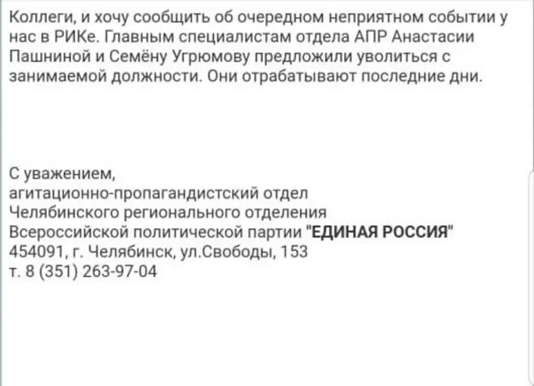 «Сначала отправили в отставку начальника отдела Ольгу Кондратьеву, потом уволилась Светлана Вешкина, теперь заставили написать заявления Анастасию Пашнину и Семена Угрюмова. Осталась только рядовой специалист Инесса Макарова. Фактически отдел прекратил существование. При том, что нужно начинать готовиться к праймериз: следующей осенью пройдут выборы в Заксобрание области и самая крупная муниципальная кампания [во всех городах и районах, кроме Челябинска и Трехгорного]», — добавил собеседник.