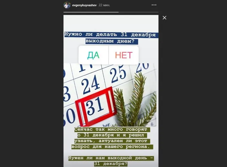 «Сейчас так много говорят о 31 декабря, и я решил узнать, актуален ли этот вопрос для нашего региона. Нужен ли выходной день 31 декабря?» — спросил Куйвашев у своих подписчиков.