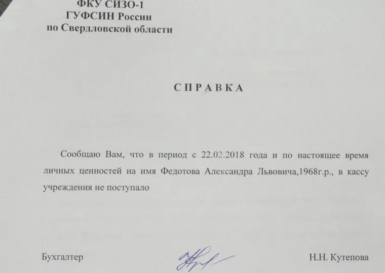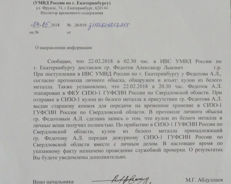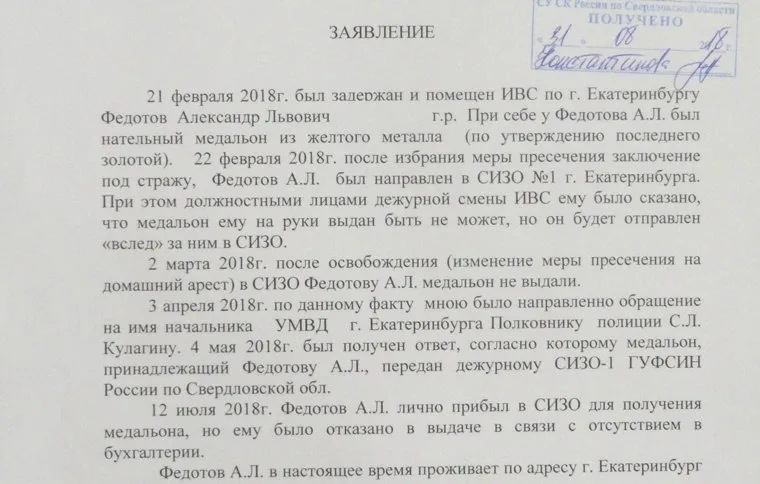 Через две недели Сандро отпустили под домашний арест, но медальон не отдали. Его защитник обратился с письмом к начальнику УМВД Екатеринбурга Сергею Кулагину, от которого пришел ответ, что медальон был передан дежурному СИЗО. А руководство СИЗО-1 представило справку, что личных вещей Федотова в кассу не поступало.