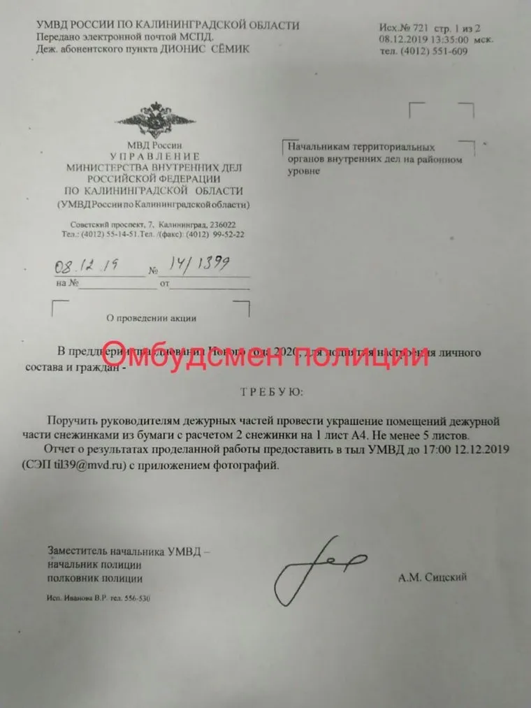 «В преддверии празднования Нового года 2020 для поднятия настроения личного состава требую: поручить руководителям дежурных частей провести украшение дежурной части снежинками», — говорится в документе, якобы подписанном начальником. Фото «приказа» опубликовала группа «Омбудсмен полиции» во «ВКонтакте».