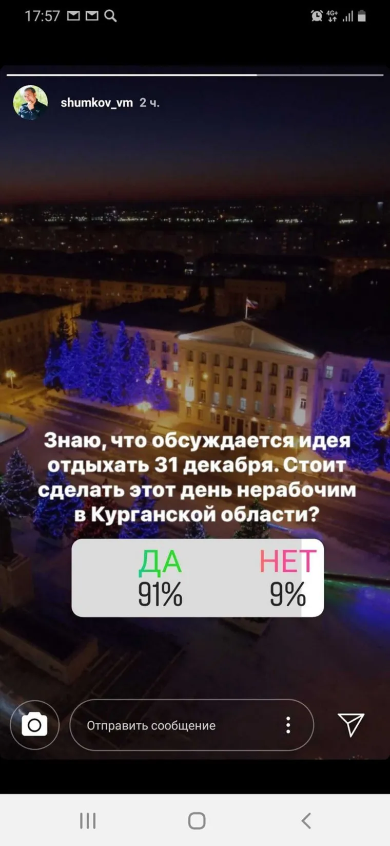 В Курганской области 31 декабря 2019 года будет выходным для госслужащих и сотрудников государственных бюджетных организаций, сообщало ранее «URA.RU». Решение об этом Шумков принял по итогам голосования , которое он проводил на своей странице в соцсети Instagram (деятельность запрещена в РФ): 91% опрошенных высказались «за».