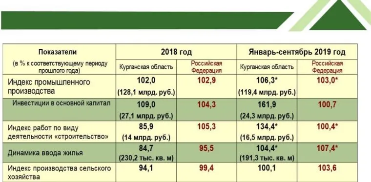 Данные за 9 месяцев по экономическим направлениям глава региона сравнил с общероссийскими. «Рост промышленного производства 106,3% (по РФ — 103%), инвестиции в основной капитал 161% (по РФ — 100,7%). Даже ставшее привычным за многие годы падение производства в сельском хозяйстве (только за 2018 — минус 5,9%) начало сменяться на пока робенький, но рост (100,1%)», — уточнил губернатор. Шумков при этом добавил, что для полного оздоровления Курганской области понадобятся годы упорного труда.