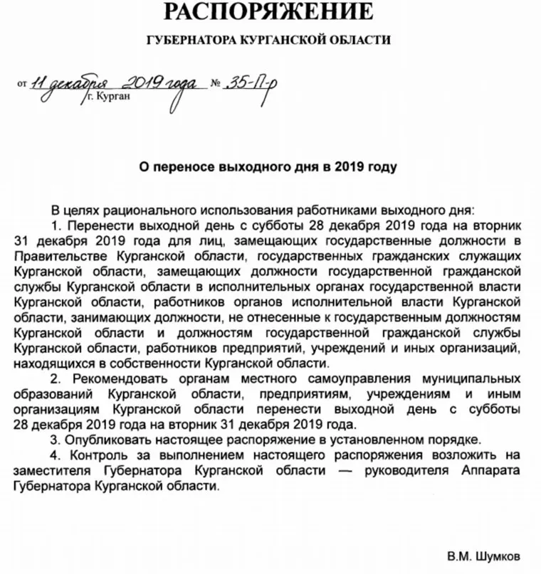 Решение губернатора Курганской области Вадима Шумкова перенести рабочий день с 31 декабря на субботу, 28 декабря может быть признано незаконным, сообщили в областной федерации профсоюзов. В регионе до сих пор нет четкого понимания, какого круга организаций касается это решение.