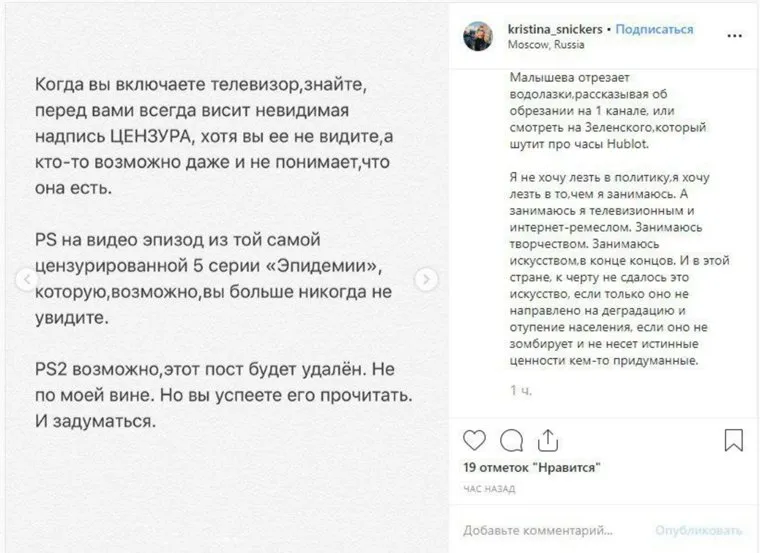 Промо-продюсер канала ТНТ Кристина Сникерс опубликовала в Instagram (деятельность запрещена в РФ) гневный пост о цензуре в телеэфире и интернете, сопроводив его фотографией с несанкционированных акций в Москве. Возмущение сотрудницы вызвала приостановка показа сериала «Эпидемия» и удаление одной из его серий, в которой силовики расстреливают мирных жителей.