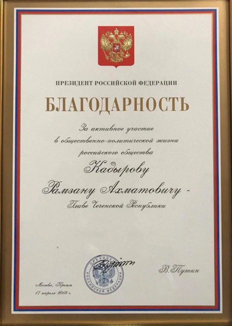 Благодарность от Путина Кадырову 18 декабря лично вручил полпред президента России в Северо-Кавказском федеральном округе (СКФО) Александр Матовников. Своими эмоциями от этого глава Чечни поделился в своем telegram-канале, признавшись, что безгранично благодарен Путину за новую награду. «Твердая позиция и постоянная поддержка Национального лидера России Владимира Путина позволили нам восстановить прочный мир, возродить лежавшую в руинах Чечню, обеспечить народу безопасность и процветание», — отметил Кадыров.
