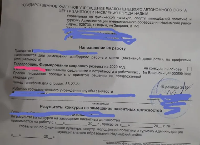 Жительнице Надыма (ЯНАО) в городском Центре занятости населения (ЦЗН) предложили трудоустроится гардеробщицей. Направление на работу для женщины — врача по профессии было опубликовано в местных пабликах «ВКонтакте».