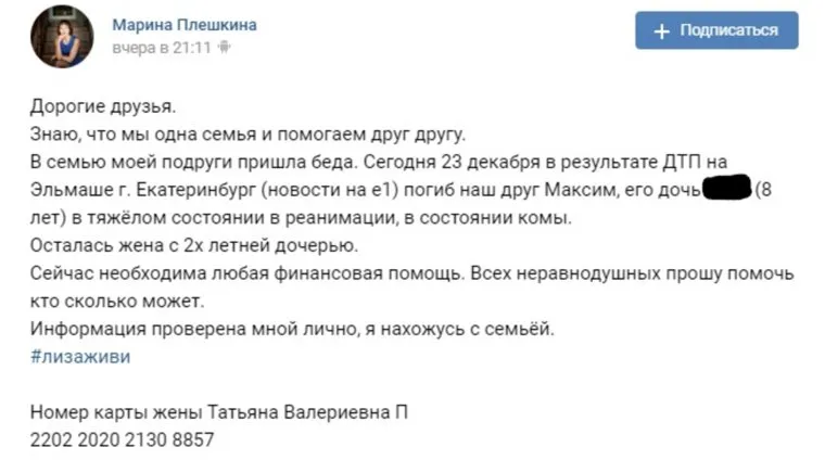 «Погиб наш друг Максим, его дочь в тяжёлом состоянии в реанимации в состоянии комы. Осталась жена с 2-летней дочерью», — написала подруга семьи Марина Плешкина в соцсети «ВКонтакте». По ее словам, сейчас она находится вместе с семьей.