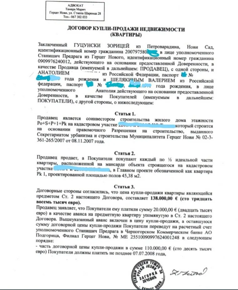 Как следует из договора купли-продажи, в 2008 году Валерий Шелякин вместе с компаньоном купили квартиру площадью в 45,38 кв. метров за 138 тысяч евро в городе Герцег Нова. По договору купли-продажи Шелякину принадлежит половина квартиры. В пересчете евро по сегодняшнему курсу стоимость недвижимости составляет более 9,6 млн рублей.