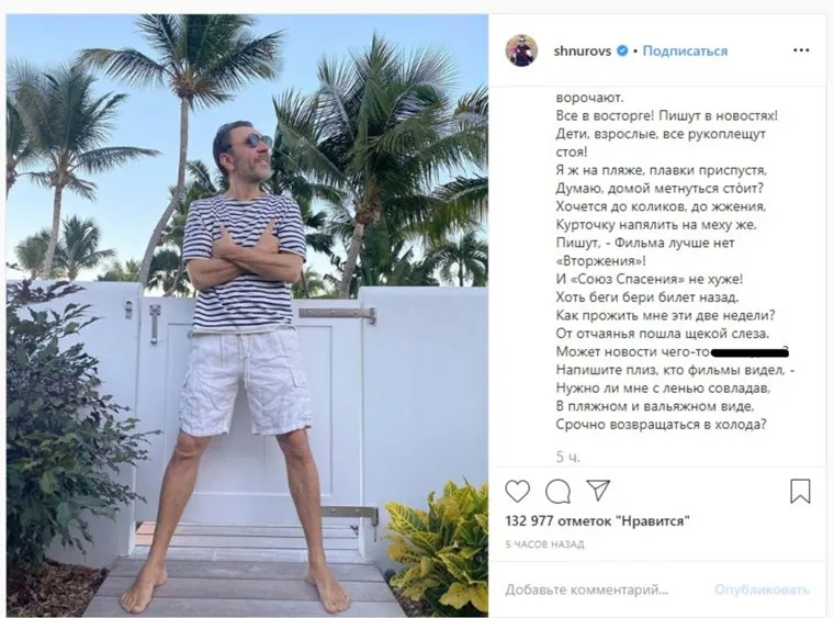 «Впечатлений в отпуске ища. Сожалею, не смогу воочию. Посмотреть на эти чудо-фильмища. Что сознанием масс легко ворочают», — пишет Шнуров. Далее музыкант спрашивает совета у своих поклонников — нужно ли ему прервать отпуск за границей ради того, чтобы успеть в кинотеатр на « Вторжение» (режиссер Федор Бондарчук) и «Союз спасения» (авторства Андрея Кравчука). «Напишите плиз, кто фильмы видел. Нужно ли мне с ленью совладав. В пляжном и вальяжном виде. Срочно возвращаться в холода», — интересуется Шнуров.