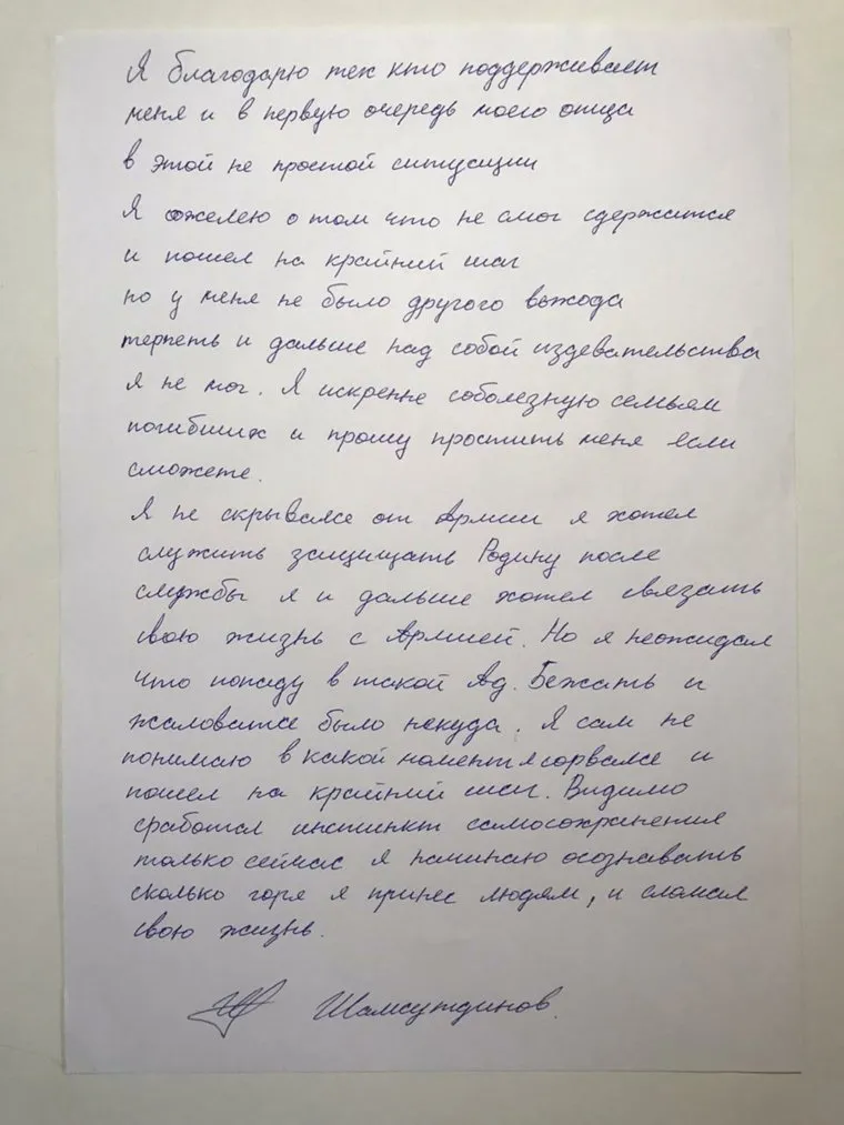 «Я искренне соболезную семьям погибших и прошу простить меня, если сможете», — написал Шамсутдинов, добавив, что у него не было выбора, поскольку он не мог дальше терпеть издевательства. По словам солдата, он готовил себя к армии, но «не ожидал, что попадет в такой ад».