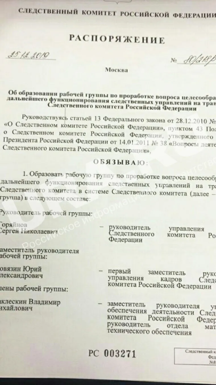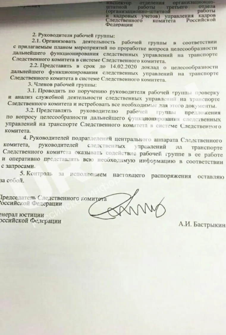 «Проводить по поручению руководителей рабочей группы проверку и анализ служебной деятельности следственных управлений на транспорте. Представлять руководителю рабочей группы предложения по вопросу целесообразности дальнейшего функционирования следственных управлений на транспорте СК в системе Следственного комитета»», — сказано в распоряжении Александра Бастрыкина.