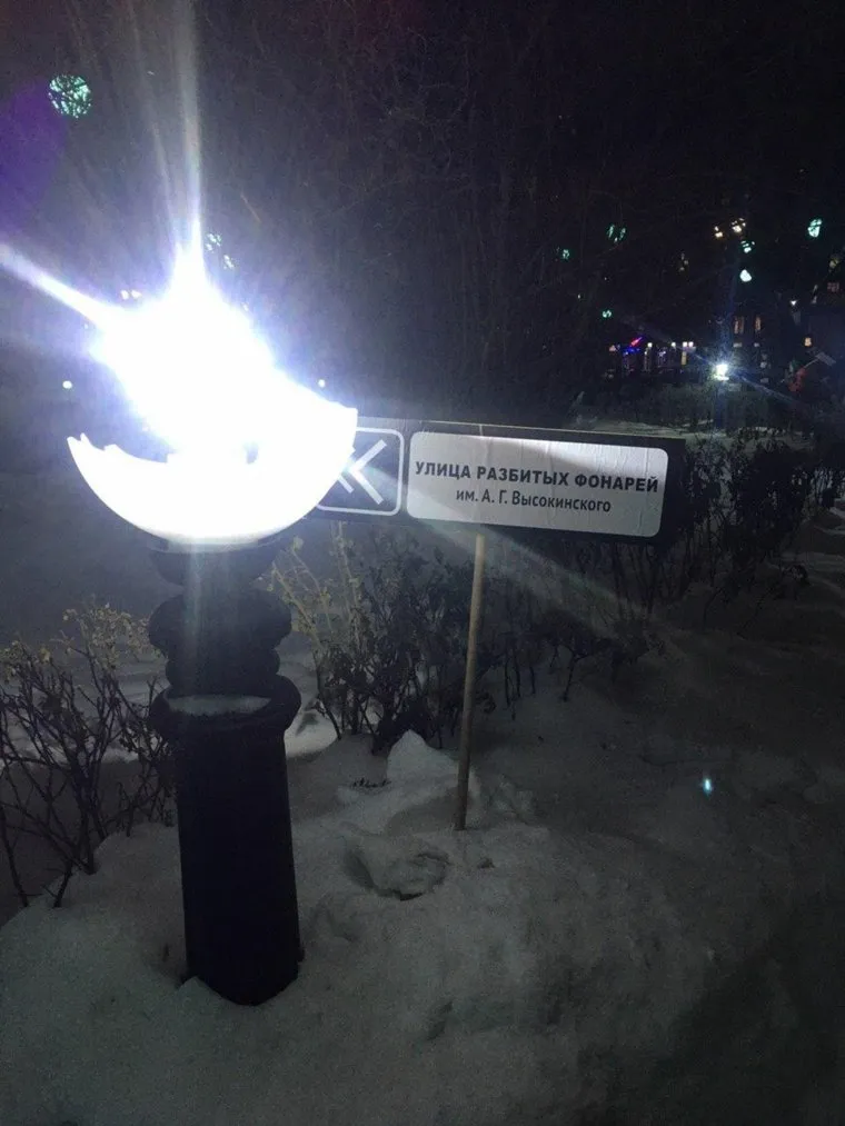 «Улица разбитых фонарей им. А. Г. Высокинского», — написано на указателях. В сквере появилось несколько таких табличек, часть из них установили возле поврежденных светильников. Плафоны в сквере разбивались и ранее, но в этот раз это было сделано массово — пострадали пять фонарей.