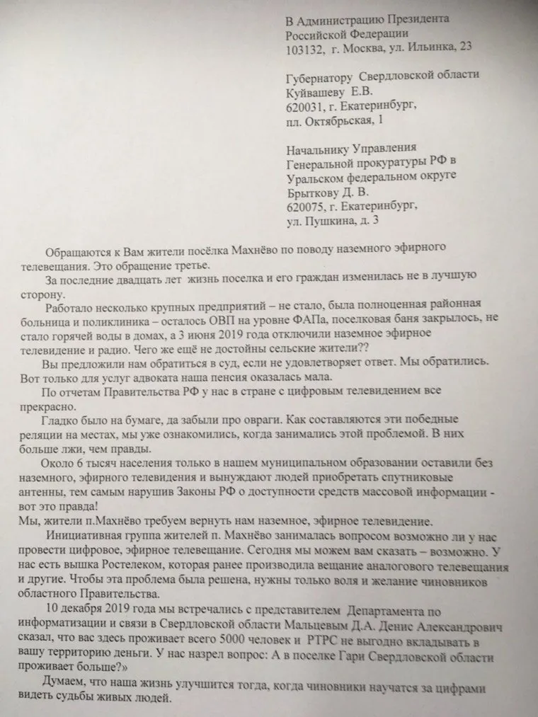 Жители села Махнево (Свердловская область) написали письмо президенту РФ Владимиру Путину с жалобой на то, что после перехода на цифровое ТВ 3 июня 2019 года они остались без вещания. Письмо подписали 126 человек.