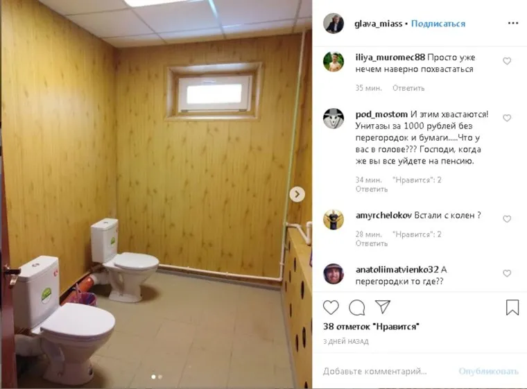 Пользователи, судя по комментариям, тоже были удивлены. «И этим хвастаются! Унитазы за 1000 рублей без перегородок и бумаги. Что у вас в голове?» — пишет pod_mostom. «А где фото, на котором глава и начальник тестируют объект?» — интересуется iris__massage. «21 век техногенности. Зрителю показывают дырки, замещенные унитазами», — замечает rektif. «Встали с колен?» — саркастично спрашивает amyrchelokov.