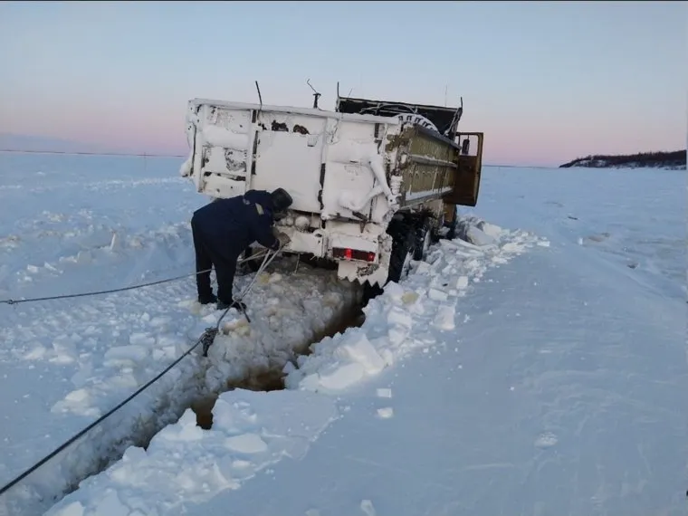 «Кто собирается ехать по закрытому зимнику Аксарка — Яр-Сале, лучше подумайте дважды! — сообщил анонимный автор в одной из салехардских групп социальной сети „ВКонтакте“. — На лед выступила вода, вчера тяжеловесы застрявшие стояли, сама трасса убитая». Свое сообщение очевидец сопроводил фотографиями с места, где во льду застряли несколько грузовиков.
