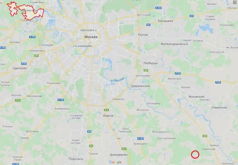 Вверх слева — город Красногорск, где находится бизнес Леонида Петухова. Точка внизу справа — место незаконной охоты в Раменском районе Подмосковья