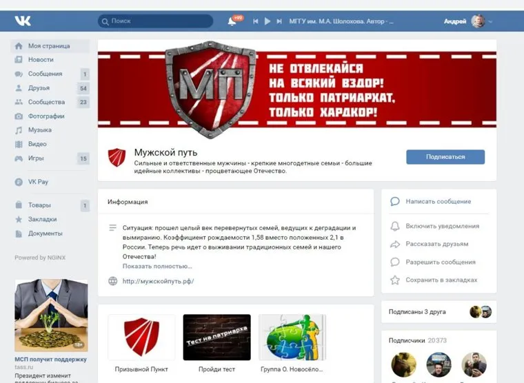 Движение «Мужской путь» появилось в соцсетях в 2018 году и объединяет сегодня 20 тысяч подписчиков. Его основная идея: без сильных мужчин не будет ни крепких семей, ни процветающего Отечества. Новогоднее поздравление руководителя движения Андрей Брезгина посмотрела тысяча человек. Среди активистов указаны «начальник штаба» Ираклий Багратион и «командир ячейки МП-Екб» Игнат Боровик. ПТО (производственно-технический отдел) возглавляет Олег Бордиану, а «кузницей молодого патриарха» занимается Кирилл Хабибуллин.