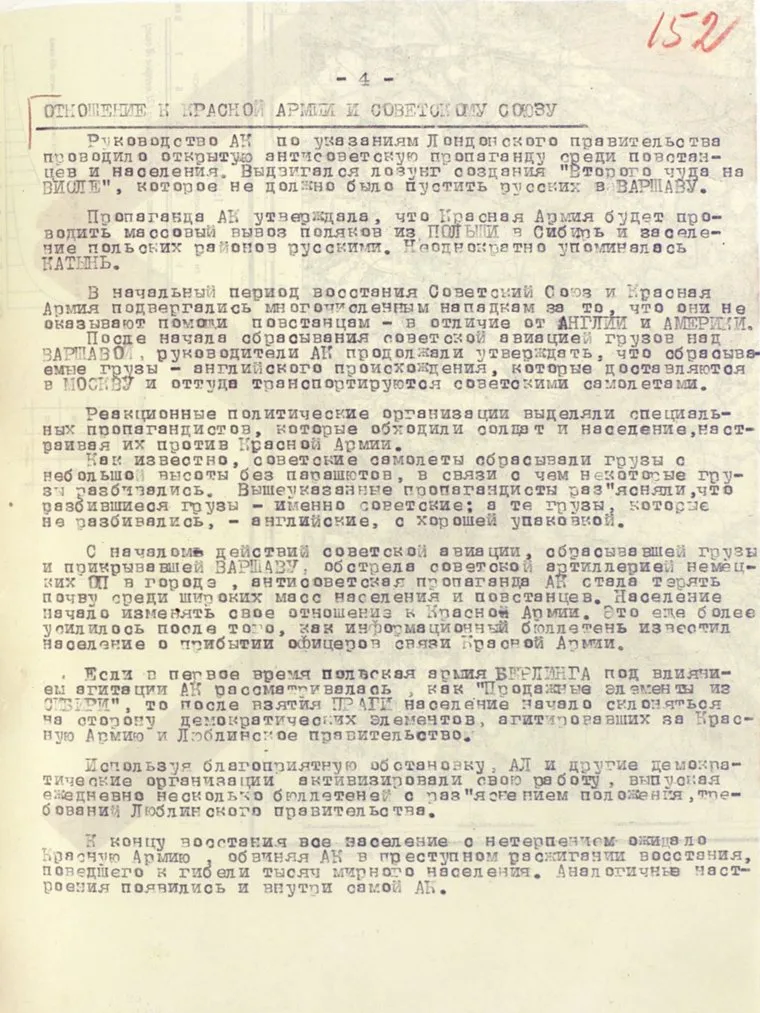 Документы, в частности, посвящены Варшавскому восстанию в сентябре 1944 года. В показаниях свидетелей тех событий говорится о том, что цели этого восстания не соответствовали ожиданиям местного населения. Так, подразделения Армии Крайовой действовали против украинцев и евреев, а советских офицеров брали в заложники для обмена с Красной Армией. «Реакционные элементы и, в первую очередь, боевая подпольная организация АК проводили ярко выраженную националистическую повестку», — приводятся слова разведчика штаба, офицера Красной Армии.