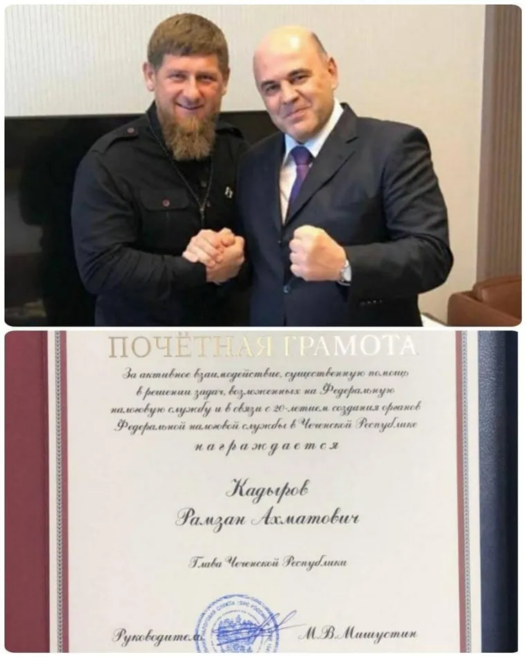 Бывший руководитель Федеральной налоговой службы (ФНС) России Михаил Мишустин, недавно возглавивший российское правительство, вручил почетную грамоту главе Чечни Рамзану Кадырову. Об этом сообщил премьер-министр республики Муслим Хучиев.