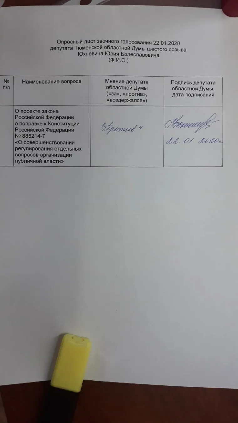 «Депутаты голосовали за поправки в ходе опроса. Большинство из них поддержали изменения, озвученные главой страны в ходе послания Федеральному собранию РФ», — рассказал инсайдер. Официальные результаты заочного голосования оперативно уточнить не удалось — они будут опубликованы позднее. Известно, что против поправок проголосовал член фракции КПРФ Юрий Юхневич — фото своего опросного листа он опубликовал в соцсети «ВКонтакте».