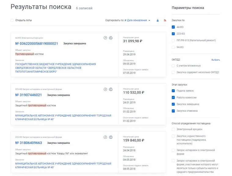 Екатеринбургская городская клиническая больница №40, где находится крупнейшее в городе инфекционное отделение, закупила 12 костюмов по 9200 рублей. Сумма сделки составила 110 тысяч рублей, говорится на сайте госзакупок.