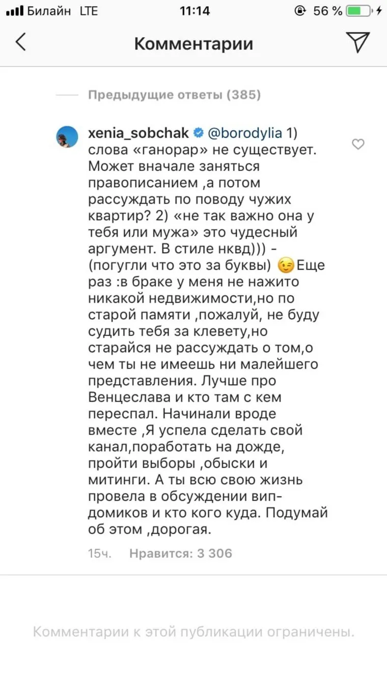 «Готовишься к рекламе поправок в конституцию?» — съязвила Собчак. На что получила обвинение от Бородиной: «Ксюх, а ты мне этот коммент пишешь из подаренной мэрией квартиры или вы сдаете?». Собчак в свою очередь напомнила, что не имеет никакой квартиры в центре Москвы, а проживает за городом, пишет сайт VSE42.Ru .