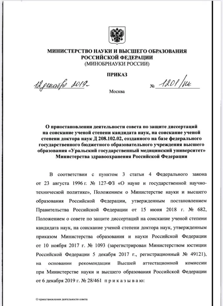 «Приказываю приостановить с 10 января 2020 года деятельность совета по защите диссертаций на соискание ученой степени кандидата наук, на соискание ученой степени доктора наук, созданного на базе ФГБОУ ВО УГМУ Минздрава РФ», — написано в документе. Контроль за исполнением приказа замминистра оставил за собой.