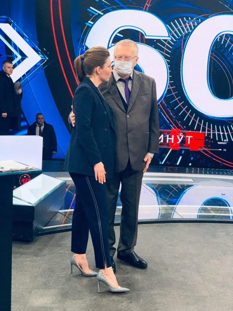 Депутат Госдумы РФ Владимир Жириновский пришел на съемки ток-шоу «60 минут» в медицинской маске. Соответствующий снимок опубликовала в своем telegram-канале ведущая программы Ольга Скабеева.