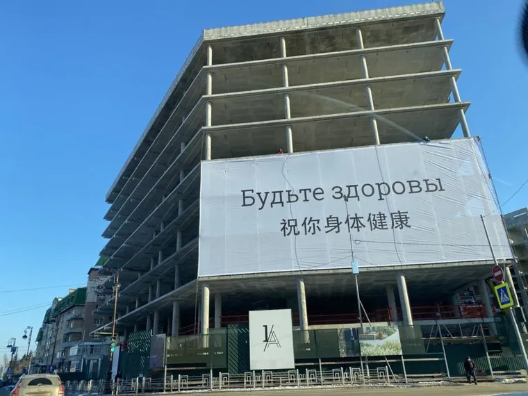 Тюменский застройщик разместил на одном из своих объектов огромный баннер на русском и китайском языках. Жителям города строители пожелали здоровья.