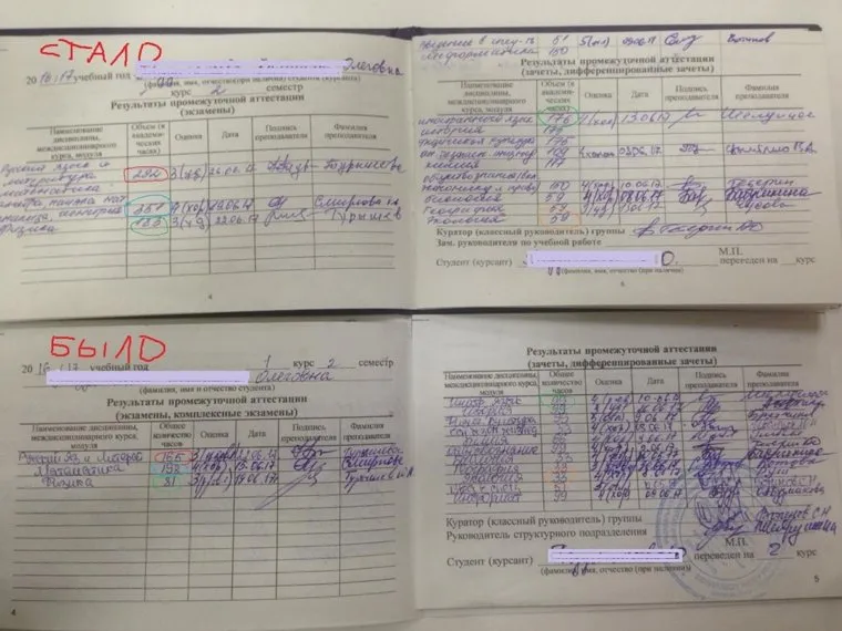 «Из зачеток вырывались все страницы (кроме страницы с данными и фото студентов), а вместо них вклеивались новые — с подделанными подписями, часами обучения, дисциплинами. Я лично знала преподавателя [вуза], который уже умер, но его подпись тоже подделали в зачетной книжке», — рассказала Подлесных.