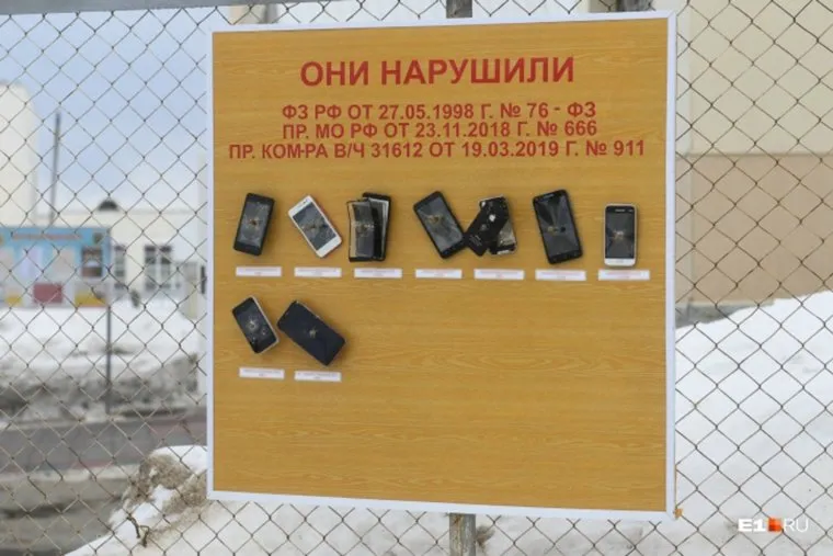 «Они нарушили Федеральный закон Российской Федерации», — написано на стенде с приколоченными телефонами. Под каждым устройством указаны имя и фамилия нарушителя, передает портал «E1.ru».