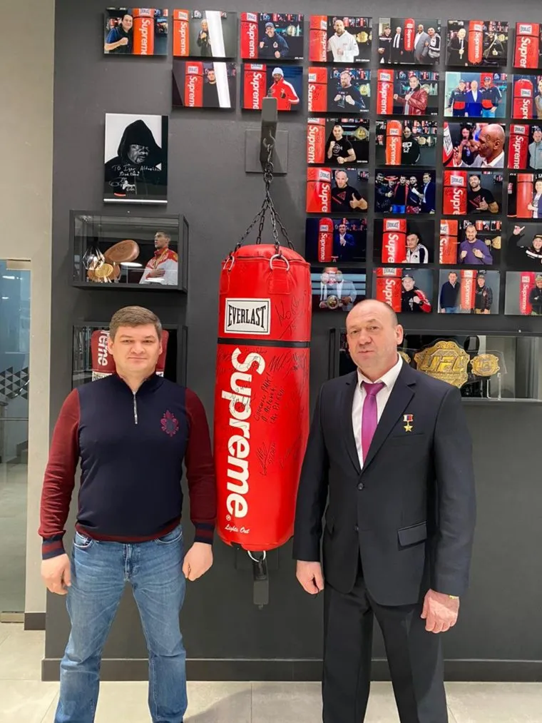 Михаил Кайгородов (слева) и Сергей Евланов рядом с боксерской грушей, на которой оставляют автографы все звезды спорта
