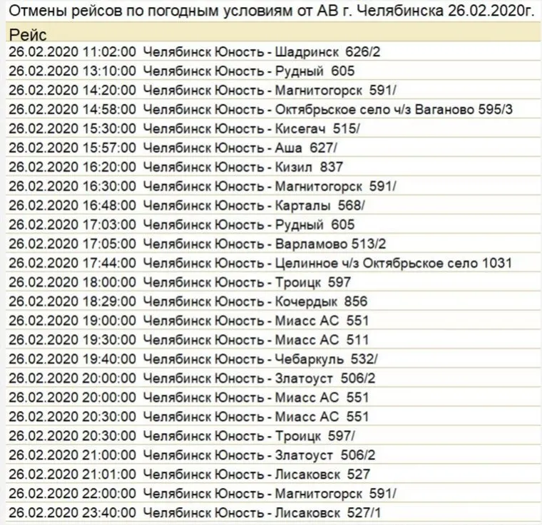 По данным ООО «Служба организации движения», первыми отменены рейсы в горнозаводскую часть Южного Урала и международные рейсы в Казахстан.
