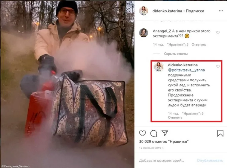 В ноябре 2019 года Екатерина опубликовала пост в Instagram (деятельность запрещена в РФ), где Валентин находится на открытом воздухе с огнетушителем и несколькими сумками. «Он сам все купил и провел эксперимент», — писала блогер. Диденко поясняла, что из подручных средств можно получить сухой лед «и вспомнить его свойства».