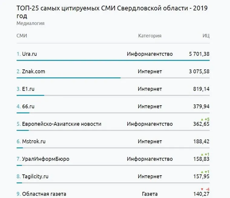 На второй и третьей строчках расположились интернет-газета Znak.com (отрыв от которого — почти в два раза) и городской портал E1.ru (отрыв более чем в пять раз). В пятерку самых цитируемых выбились «Европейско-Азиатские новости», а сразу вслед за ними (на шестом месте) — информагентство из Нижнего Тагила «Между строк».
