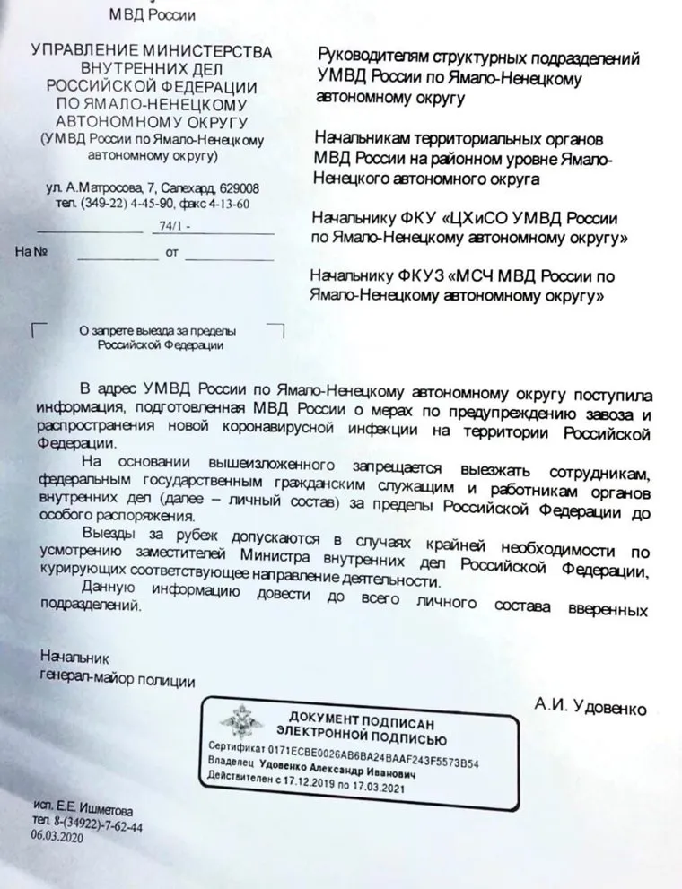 Сотрудникам ямальской полиции запретили выезжать за пределы России из-за коронавирусной инфекции. Фотография указа подписанная главой УМВД по ЯНАО Александром Удовенко была опубликована в группе «Омбусмен полиции» в социальной сети «ВКонтакте».