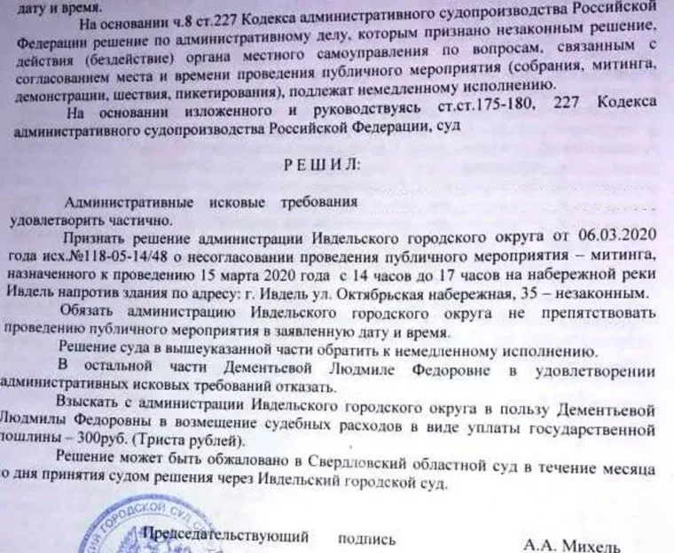 «Признать решение администрации Ивдельского городского округа… о несогласовании проведения публичного мероприятия — митинга, назначенного к проведению 15 марта 2020 года… незаконным, — решил судья Ивдельского городского суда Алексей Михель. — Решение суда в вышеуказанной части обратить к немедленному исполнению».