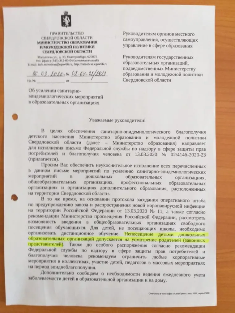 «Для детей, не посещающих школы, необходимо организовать дистанционное обучение, — говорится в письме министерства образования Свердловской области главам муниципалитетов и руководителям образовательных учреждений. — Непосещение детьми дошкольных образовательных допускается на усмотрение родителей».
